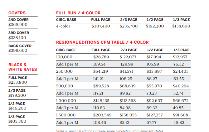 You can also buy more traditional advertising units within the magazine. How much you’ll pay depends on the color and size of the unit you want: